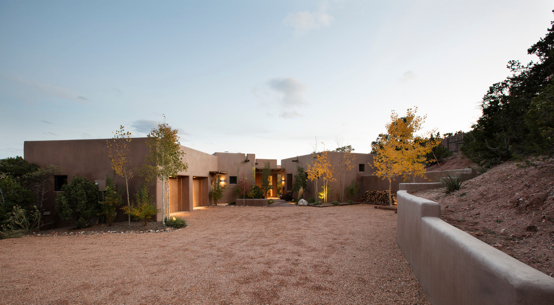 A gentle driveway winds down to a welcoming auto court and landscaped entry. The building bench affords open and elevated views to the south and east from the main residence, while a courtyard and guest studio are carved into the hillside.