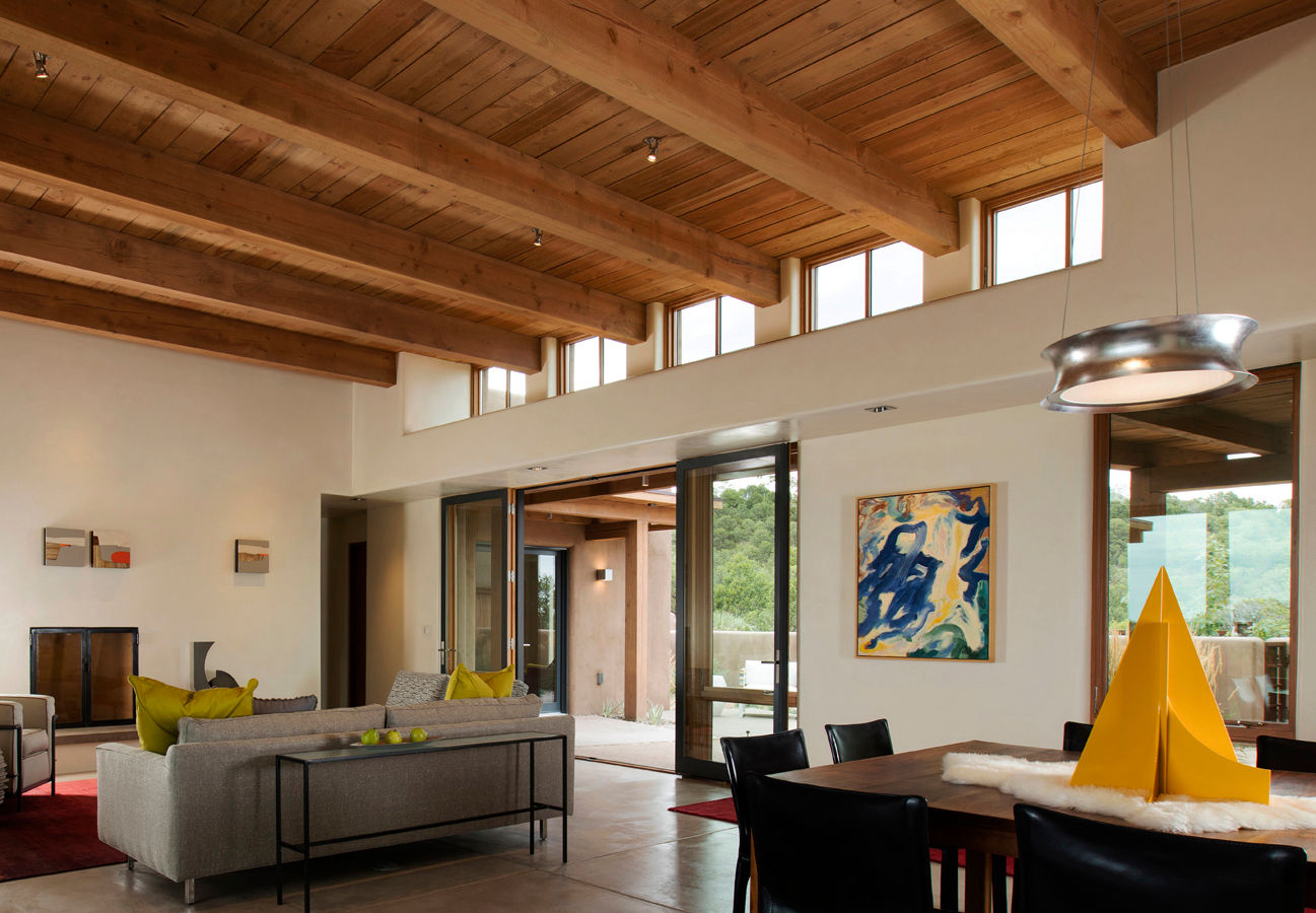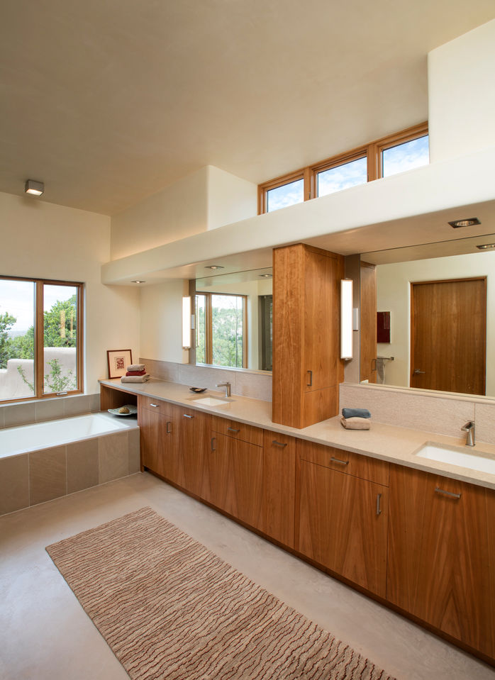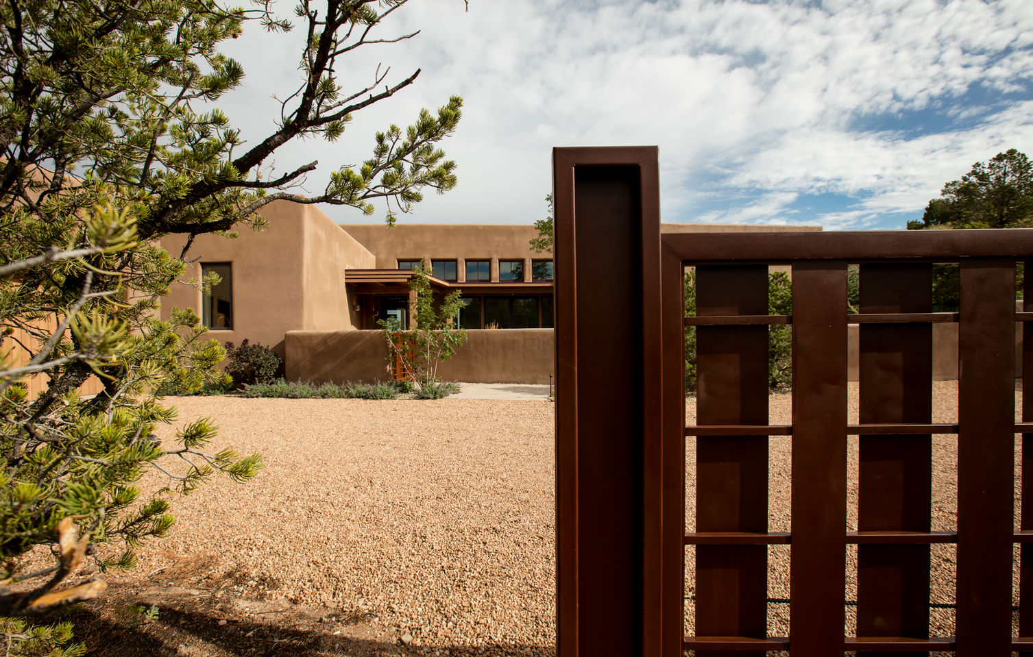 For this challenging site in the Santa Fe foothills, the residence and guesthouse are finessed into two parallel building benches. Reminiscent of local cliff dwellings and European hill towns, outdoor rooms are woven into a sheltering floor plan with views of adjacent and distant mountains and valleys.
