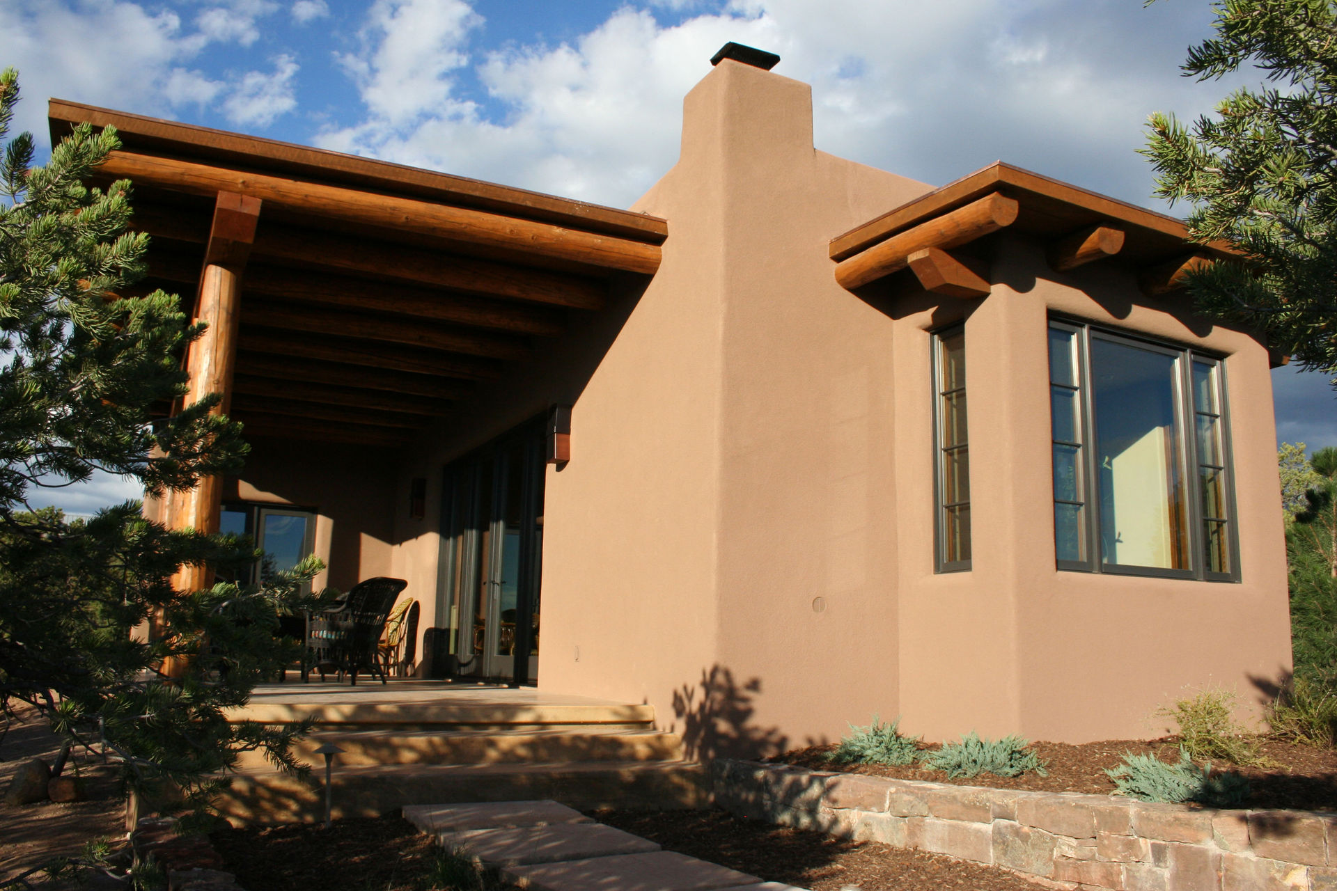The Santa Fe Escarpment Ordinance greatly limited improvement options on this dramatic ridge-top site. Building footprints, exterior living areas and the auto court entry are carved into an east-west saddle and low masses are screened from public view by the untouched ridge to the west and rigorous maintenance of existing tree cover. Traditional Santa Fe design is updated by the contemporary layout, materials and detailing.